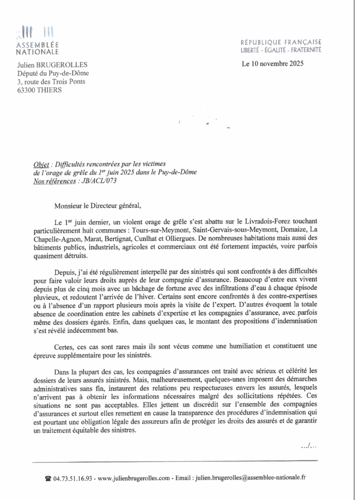 Difficultés rencontrées par les victimes de l’orage de grêle du 1er juin 2025 : le courrier de Julien Brugerolles aux compagnies d’assurance